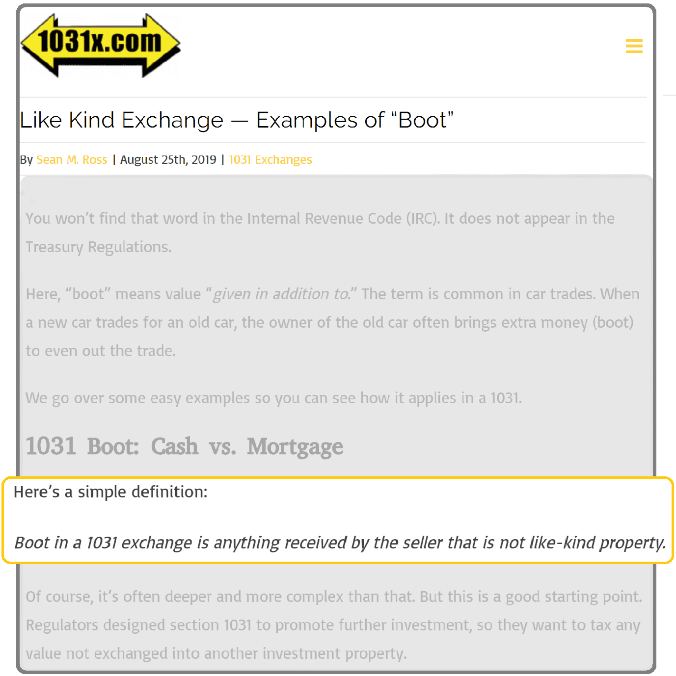 (We will explain what might count as an example “boot” in your 1031 exchange – and how to avoid it!)