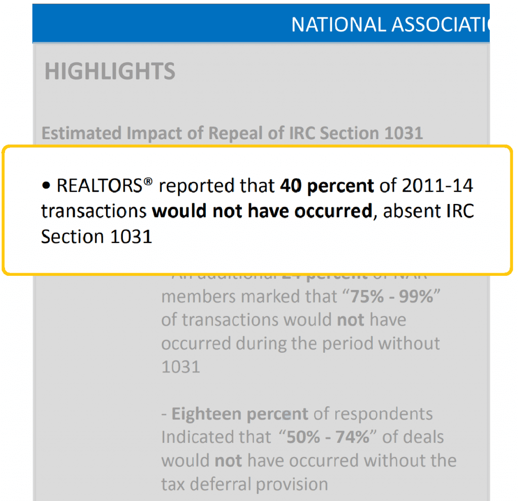 That same NAR survey estimated 40% of all RE deals would not have occurred without a 1031 exchange.