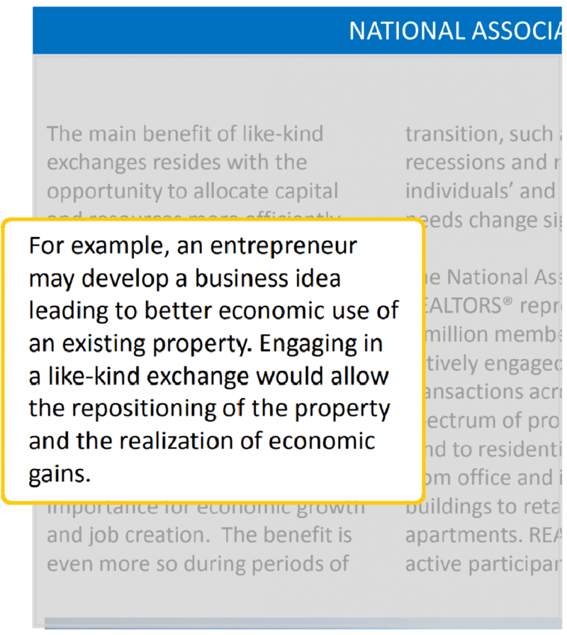 A 2015 NAR survey revealed that like-kind exchanges give entrepreneurs extra flexibility, particularly when they can readily switch to properties with “better economic use”.
