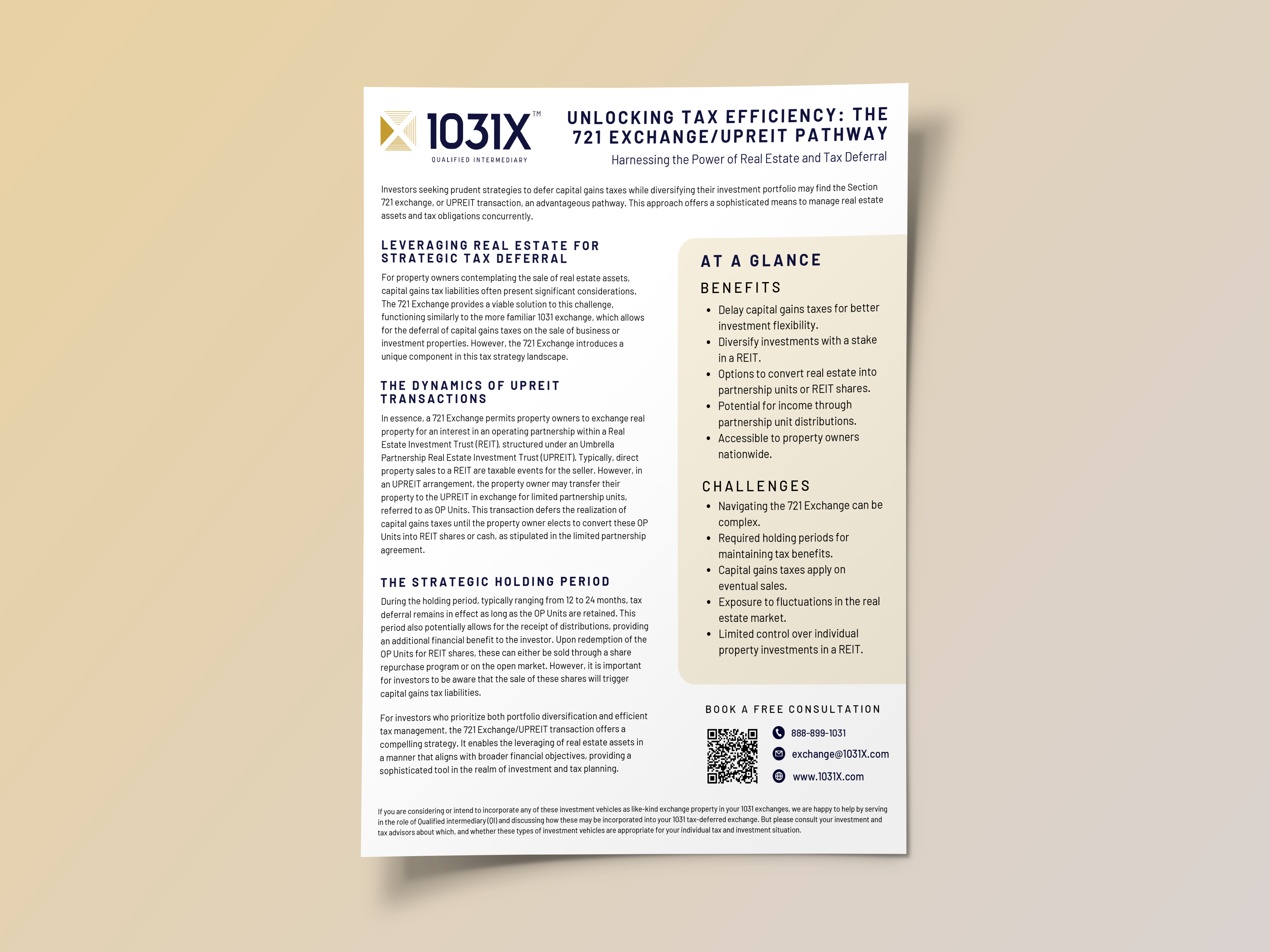 This flyer outlines the reverse 1031 exchange process, explaining how real estate investors can acquire a replacement property before selling their relinquished property. It details the mechanics of both “Exchange First” and “Exchange Last” structures and highlights the expertise of 1031X in facilitating these complex transactions. Learn how 1031X can help you navigate the intricacies of reverse exchanges to maximize your investment opportunities.