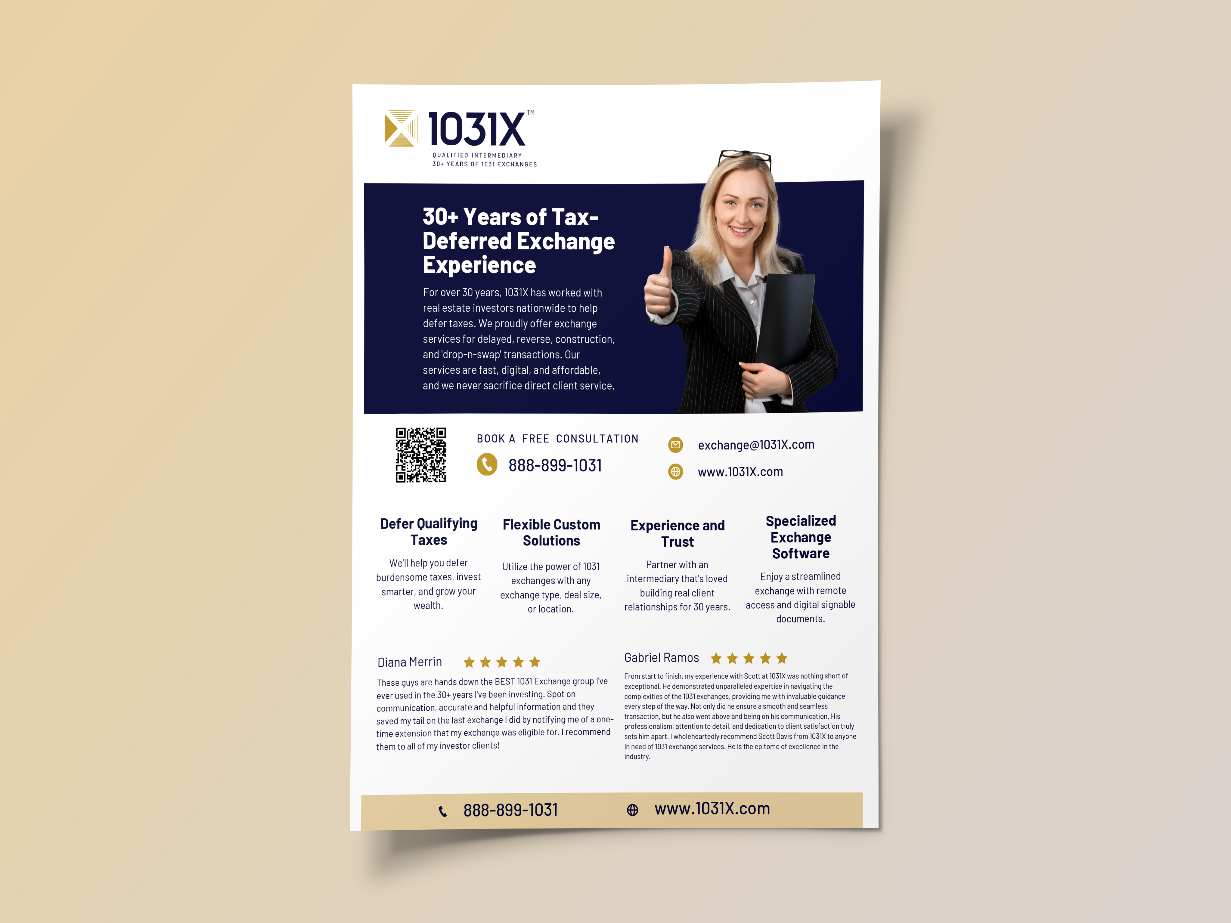 This flyer explains the various 1031 exchange services offered by 1031X, highlights our 30+ years of expertise, and showcases client testimonials that speak to our exceptional service. Learn about our flexible solutions, specialized exchange software, and how we can help you defer taxes and grow your wealth.