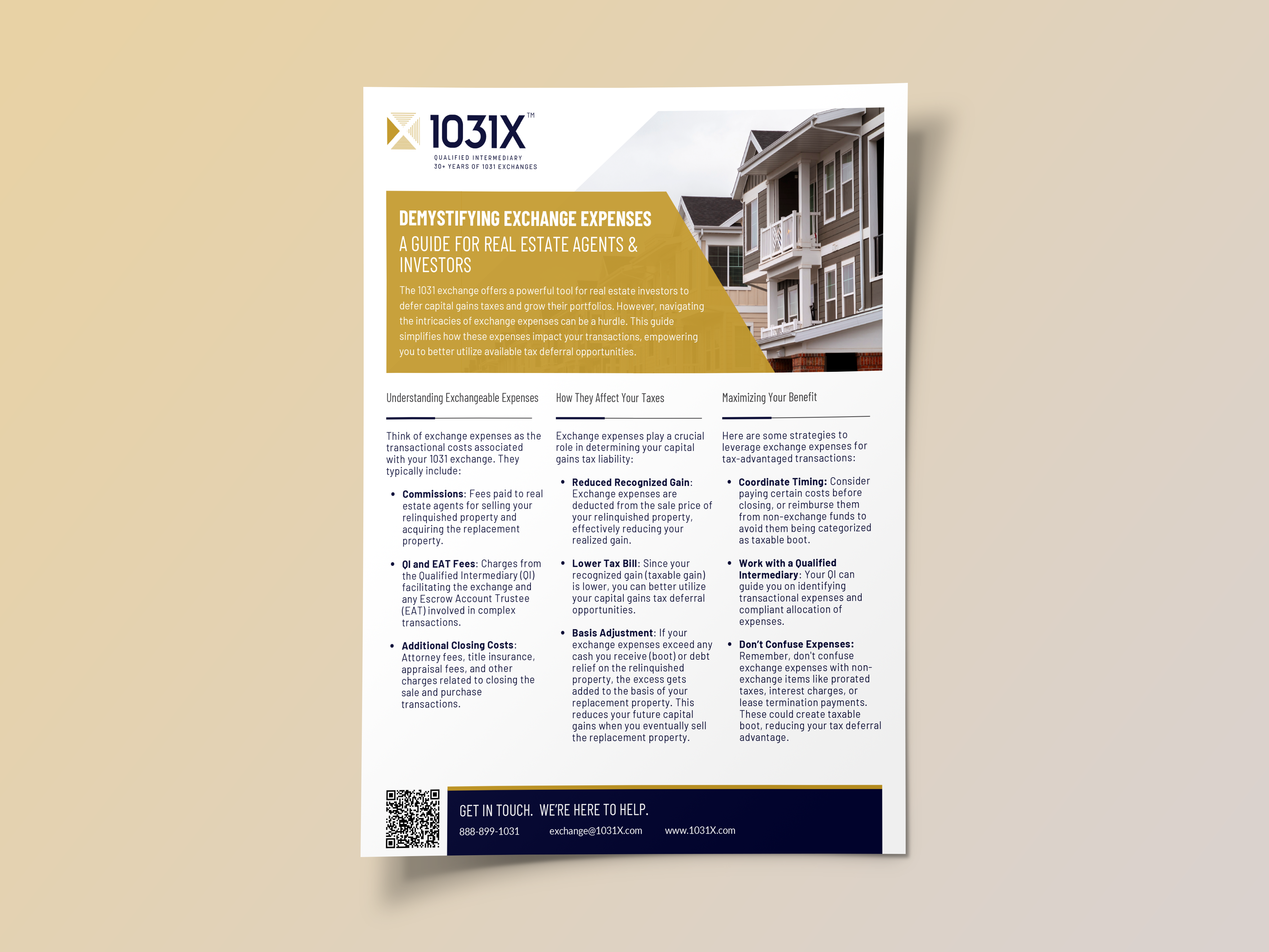This guide simplifies the intricacies of exchange expenses in 1031 exchanges, helping real estate agents and investors navigate these costs to maximize tax deferral opportunities. It covers key transactional costs such as commissions, Qualified Intermediary fees, and closing costs, and offers strategies for managing these expenses to avoid taxable boot. Understanding how exchange expenses reduce recognized gains and adjust property basis can significantly lower your capital gains tax liability. Learn how to leverage exchange expenses effectively for tax-advantaged transactions.